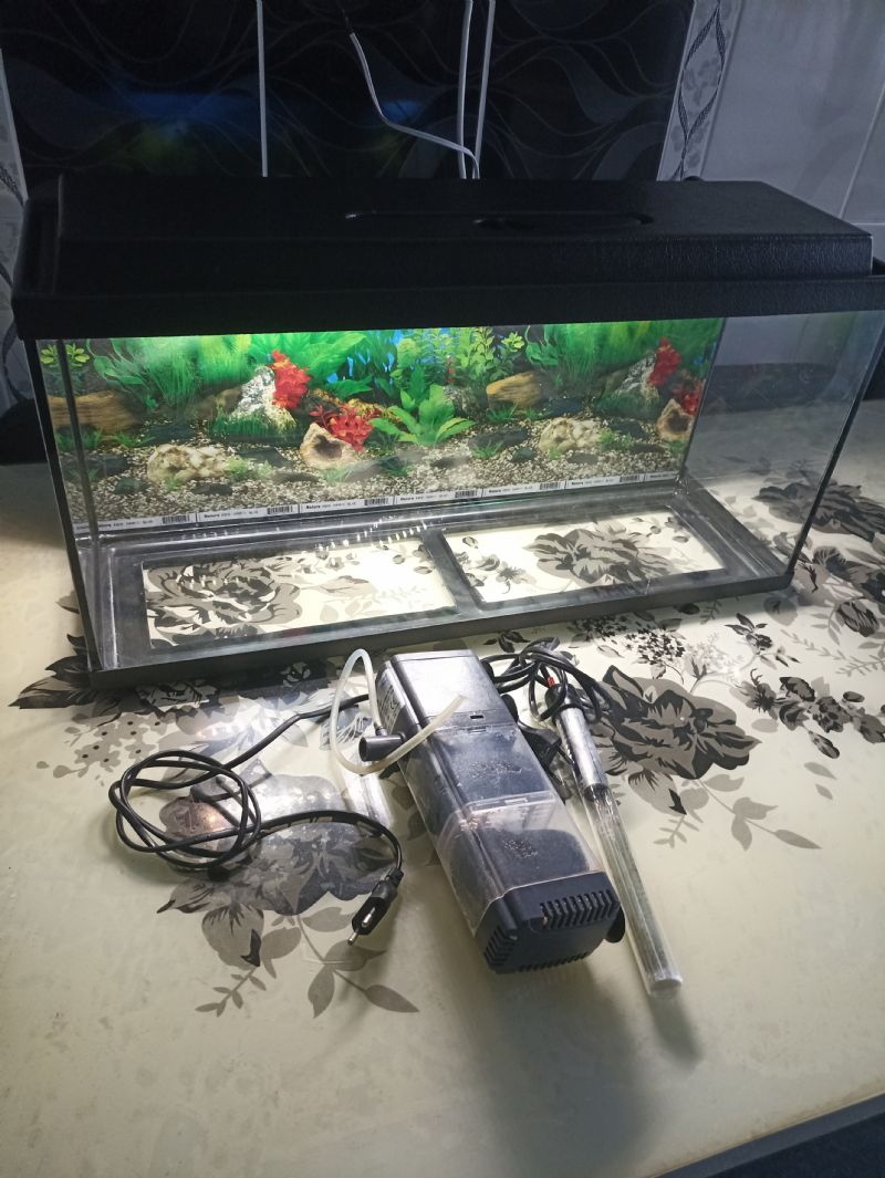 Akvaryumun yanında 1 adet kuvvetli iç filtre motoru.