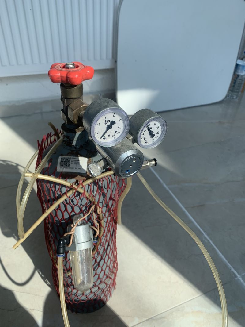 Uzun yıllar önce önce 2. El aldığım bir tüptür.Tüpte manometre vardır.Ayrıca pnömatik malzemeden kendi yaptığım kabarcık sayacı vardır.Fotoda görünen mavi renkli ince ayar vanası ve kapandığında suyun gerİ dönmesini önleyen metal çek vakfı vardır .
