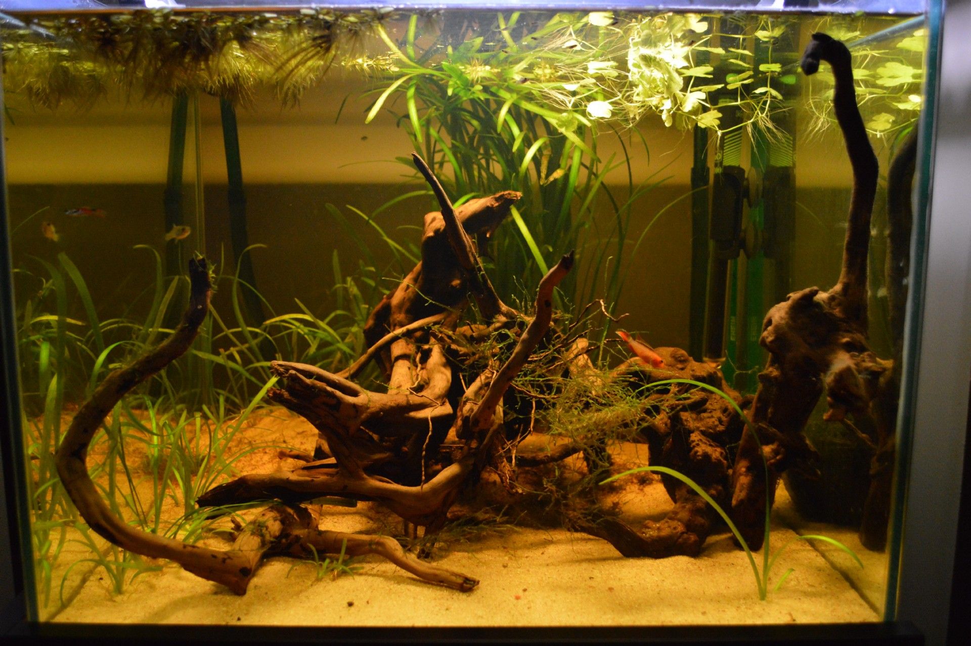 Akvaryum: 50-50-40h Filtre eheim 2213 ve filtre malzemesi olarak black water torf kullanıldı. Canlilar: - Otocincluz affinis - Apistogramma Agassizi - Poecilia wingei(Endler) Bitkiler: - Sagittaria Subulata - Hydrocotyle leucocephala - Salvinia Minima. 2 yıl boyunca dizayn değiştirilmeden bakıldı.