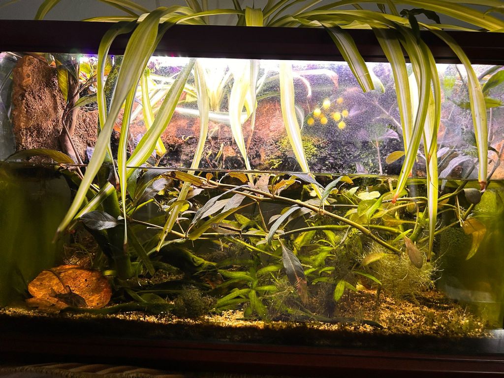Yaklaşık 3 sene önce bu akvaryumu kurdum. Aslında tam da akvaryum değil daha çok paludaryum yapmaya çalıştım. İçinde hem kara hem de su bitkileri bulunuyor böylece daha zengin bir görüntü oluşuyor. Balıklarda kendilerini daha güvende hissediyor tabii.