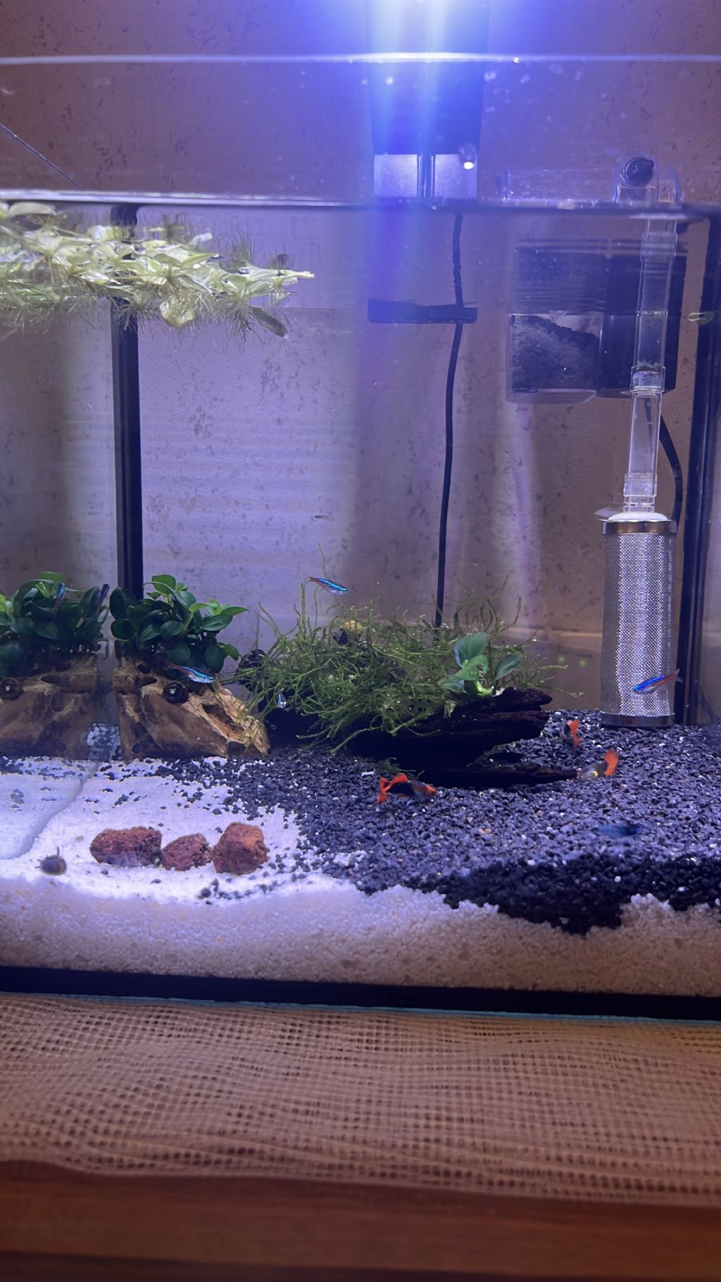 Kumu hiç yıkamadan tanka ekledim, kapsül gübreleri özenle yerleştirdim. Yati kökü, mangrow ve hindistan cevizi kabuğunu hayal ettiğim şekilde konumlandırdım, özenle bitkileri ekledim, suyu usulca doldurmaya başladım tam keyifle izlemeye başlayıp o arada co2 sistemini kuracaktım ki ...