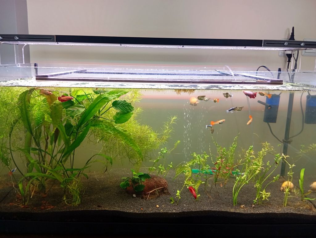 Merhaba. Tankımın son halini paylaşıyorum. Arka plana saz bitkisi ekledim ve genel olarak bitki düzeni üzerinde oynama yaptım. Görseli de bence daha hoş oldu. Yavru almaya da başladım. Dün gece 5-6 yavru sayabildim. Yavru yeme eğilimleri yok fakat yavruların hangi varyeteden olduğunu tam olarak bilemiyorum.